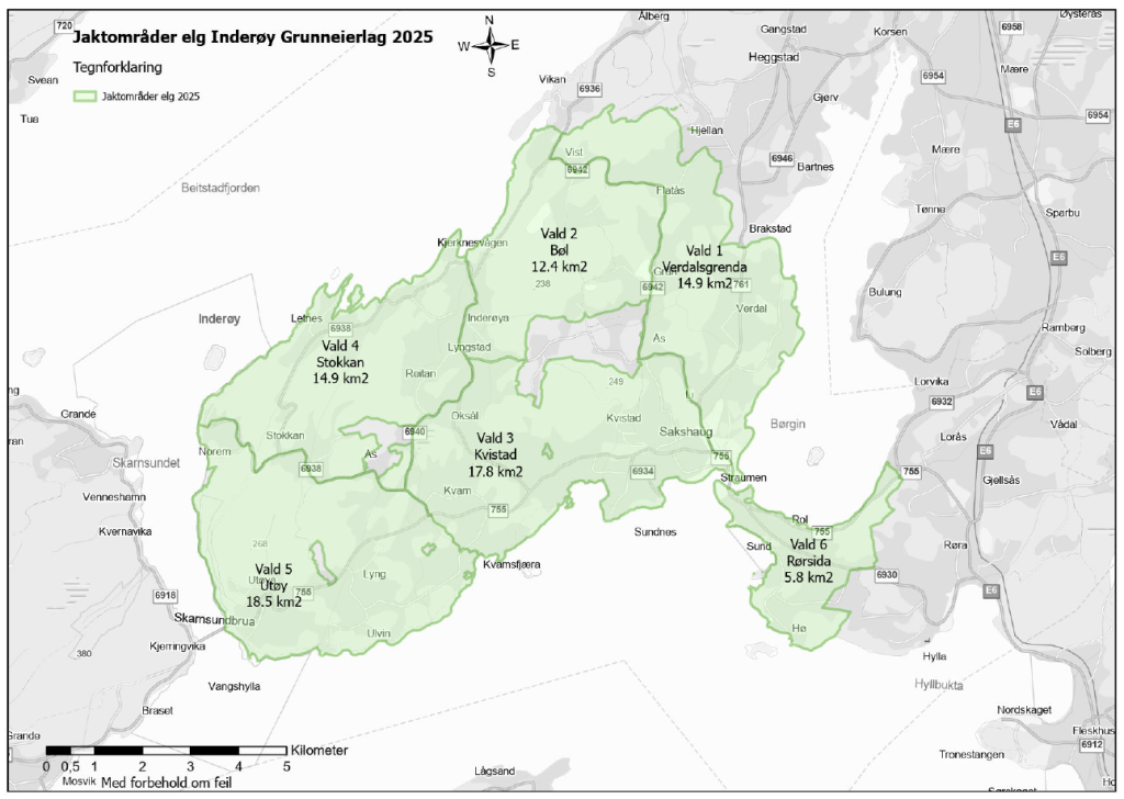 Kartet under viser jaktvald for 2025, merk at det er noen endringer i jaktvald siden 2024.
